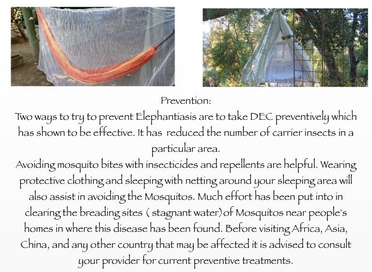 Two ways to try to prevent Elephantiasis are to take DEC preventively which has shown to be effective. It has reduced the number of carrier insects in a particular area.