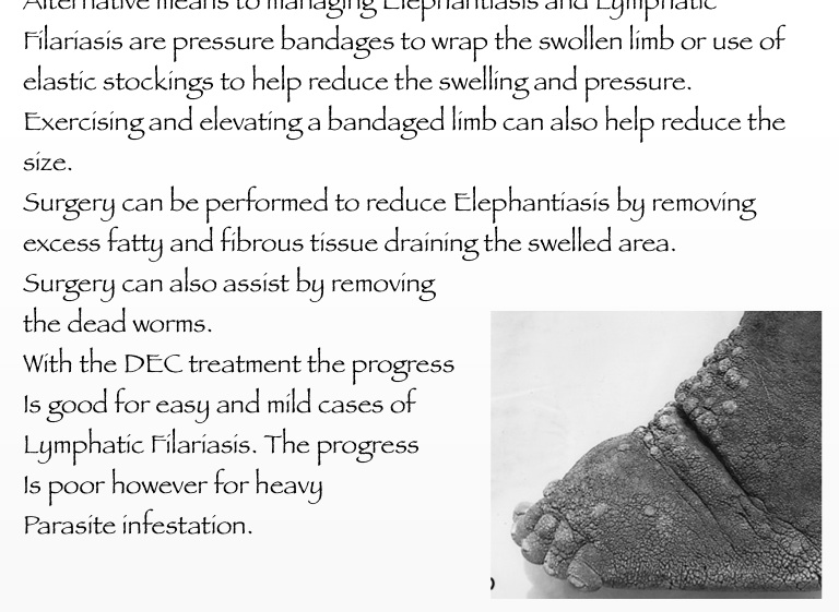 Alternative means to managing Elephantiasis and Lymphatic Filariasis are pressure bandages to wrap the swollen limb or use of elastic stockings to help reduce the swelling and pressure. Exercising and elevating a bandaged limb can also help reduce the size.