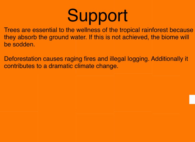 Trees are essential to the wellness of the tropical rainforest because they absorb the ground water. If this is not achieved, the biome will be sodden.