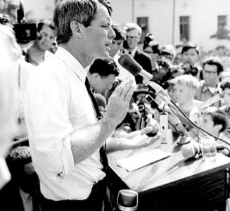 Kennedy standing at a podium giving a speech minutes before the shooting.