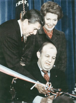 Ronald and Nancy Reagan with James Brady (one of the more severely wounded men who help saved the presidents life) cutting the rope to the new press center in the White House.
