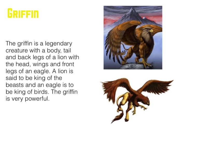 The griffin is a legendary creature with a body, tail and back legs of a lion with the head, wings and front legs of an eagle. A lion is said to be king of the beasts and an eagle is to be king of birds. The griffin is very powerful.