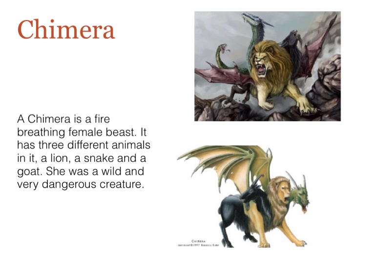 A Chimera is a fire breathing female beast. It has three different animals in it, a lion, a snake and a goat. She was a wild and very dangerous creature.