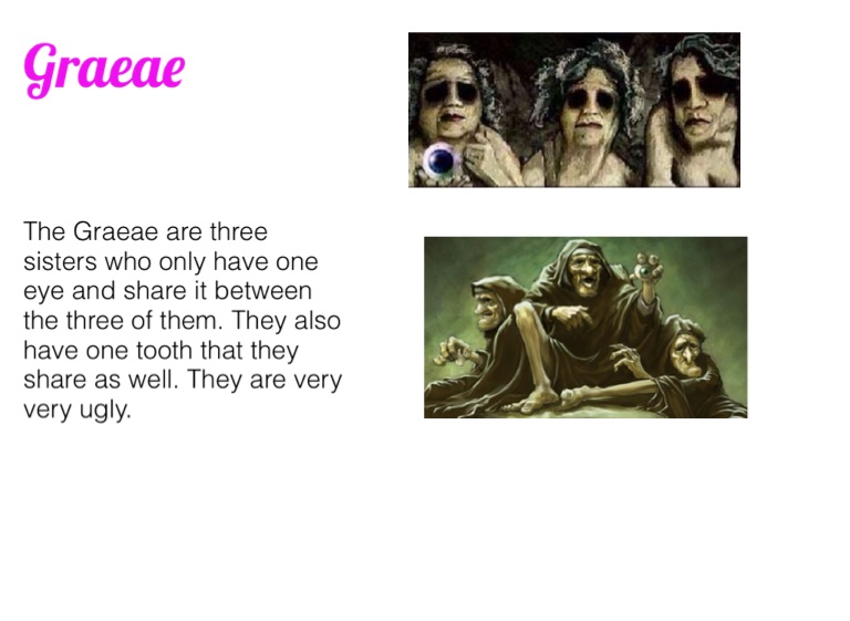 The Graeae are three sisters who only have one eye and share it between the three of them. They also have one tooth that they share as well. They are very very ugly.