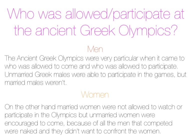 The Ancient Greek Olympics were very particular when it came to who was allowed to come and who was allowed to participate. Unmarried Greek males were able to participate in the games, but married males weren't.
