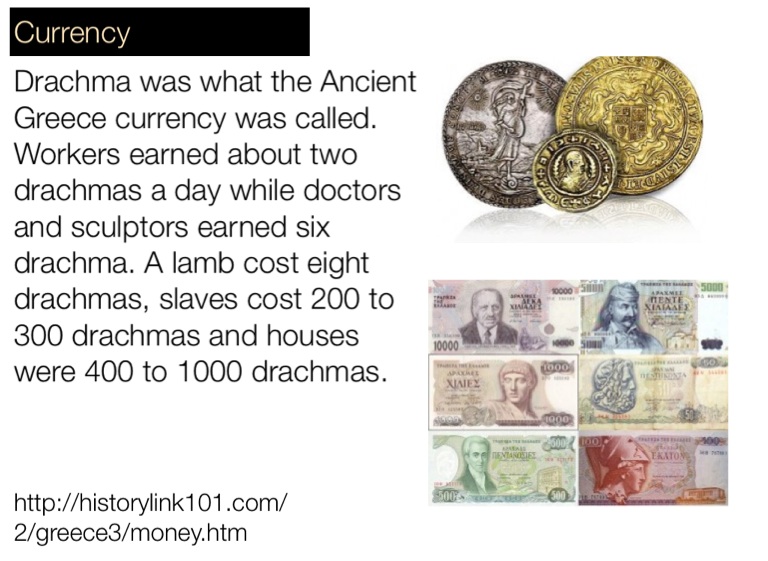 Drachma was what the Ancient Greece currency was called. Workers earned about two drachmas a day while doctors and sculptors earned six drachma. A lamb cost eight drachmas, slaves cost 200 to 300 drachmas and houses were 400 to 1000 drachmas.