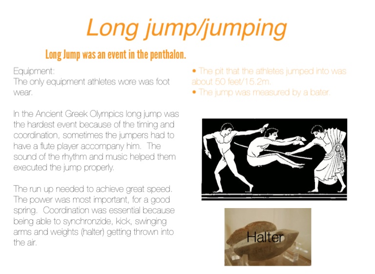 In the Ancient Greek Olympics long jump was the hardest event because of the timing and coordination, sometimes the jumpers had to have a flute player accompany him. The sound of the rhythm and music helped them executed the jump properly.