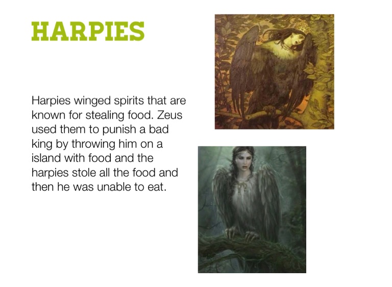 Harpies winged spirits that are known for stealing food. Zeus used them to punish a bad king by throwing him on a island with food and the harpies stole all the food and then he was unable to eat.