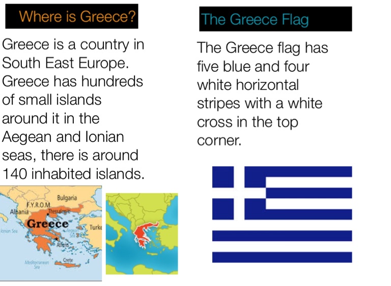 Greece is a country in South East Europe. Greece has hundreds of small islands around it in the Aegean and Ionian seas, there is around 140 inhabited islands.