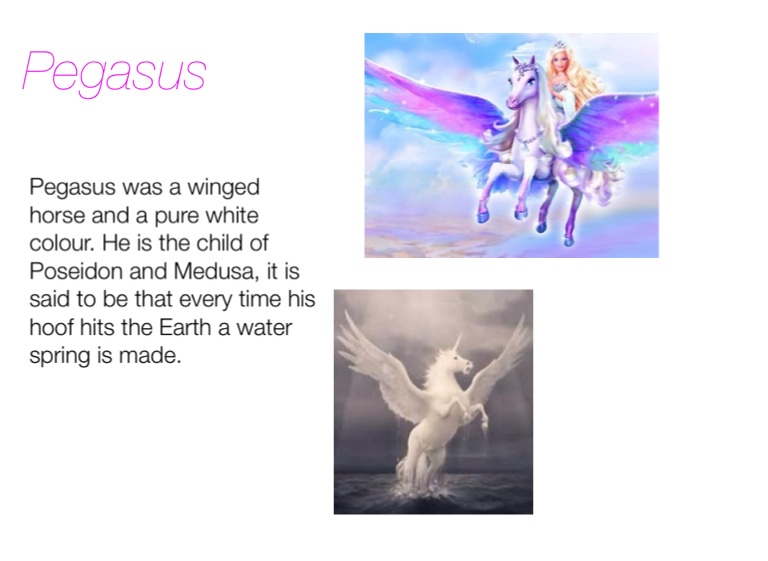 Pegasus was a winged horse and a pure white colour. He is the child of Poseidon and Medusa, it is said to be that every time his hoof hits the Earth a water spring is made.