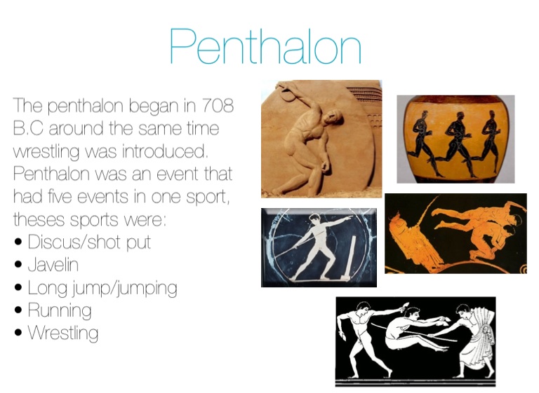 The penthalon began in 708 B.C around the same time wrestling was introduced. Penthalon was an event that had five events in one sport, theses sports were: