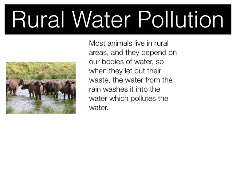 Most animals live in rural areas, and they depend on our bodies of water, so when they let out their waste, the water from the rain washes it into the water which pollutes the water.