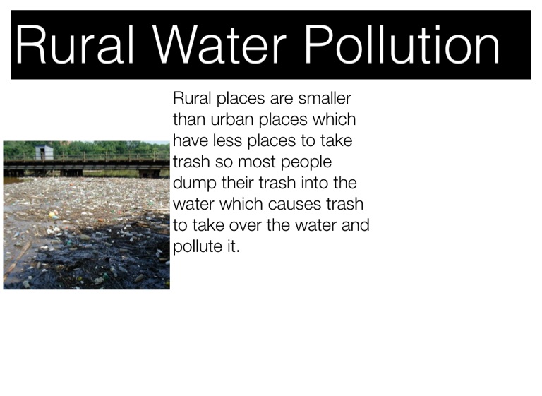 Rural places are smaller than urban places which have less places to take trash so most people dump their trash into the water which causes trash to take over the water and pollute it.