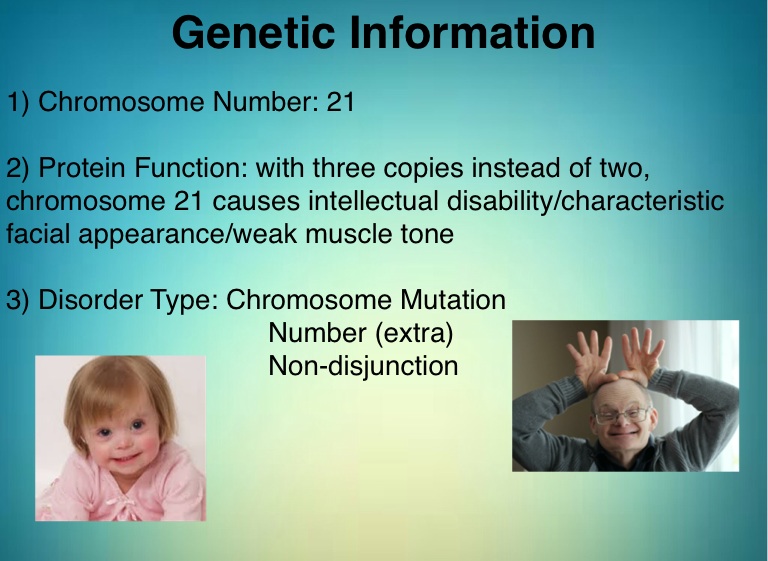 2) Protein Function: with three copies instead of two, chromosome 21 causes intellectual disability/characteristic facial appearance/weak muscle tone