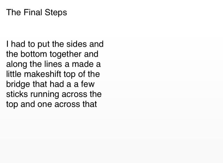 I had to put the sides and the bottom together and along the lines a made a little makeshift top of the bridge that had a a few sticks running across the top and one across that