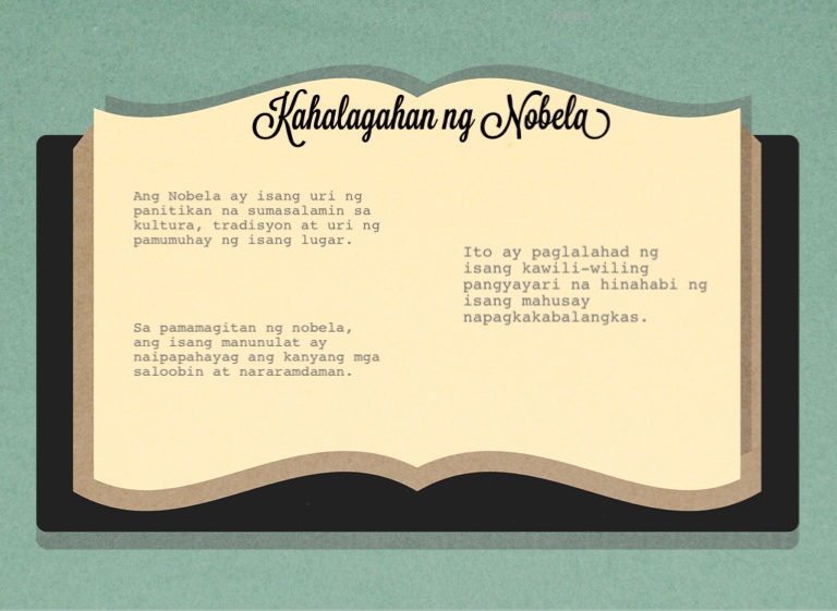 Ang Nobela ay isang uri ng panitikan na sumasalamin sa kultura, tradisyon at uri ng pamumuhay ng isang lugar.