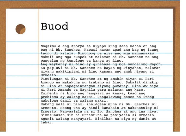 Ang maybahay ni Lino ay ginahasa ng mga sundalong Hapon. Sa pag-uwi ni Bb. Sanchez sa bayan ng Pinyahan, nalaman niyang nakikipirmi si Lino kasama ang anak niyang si Ernesto.