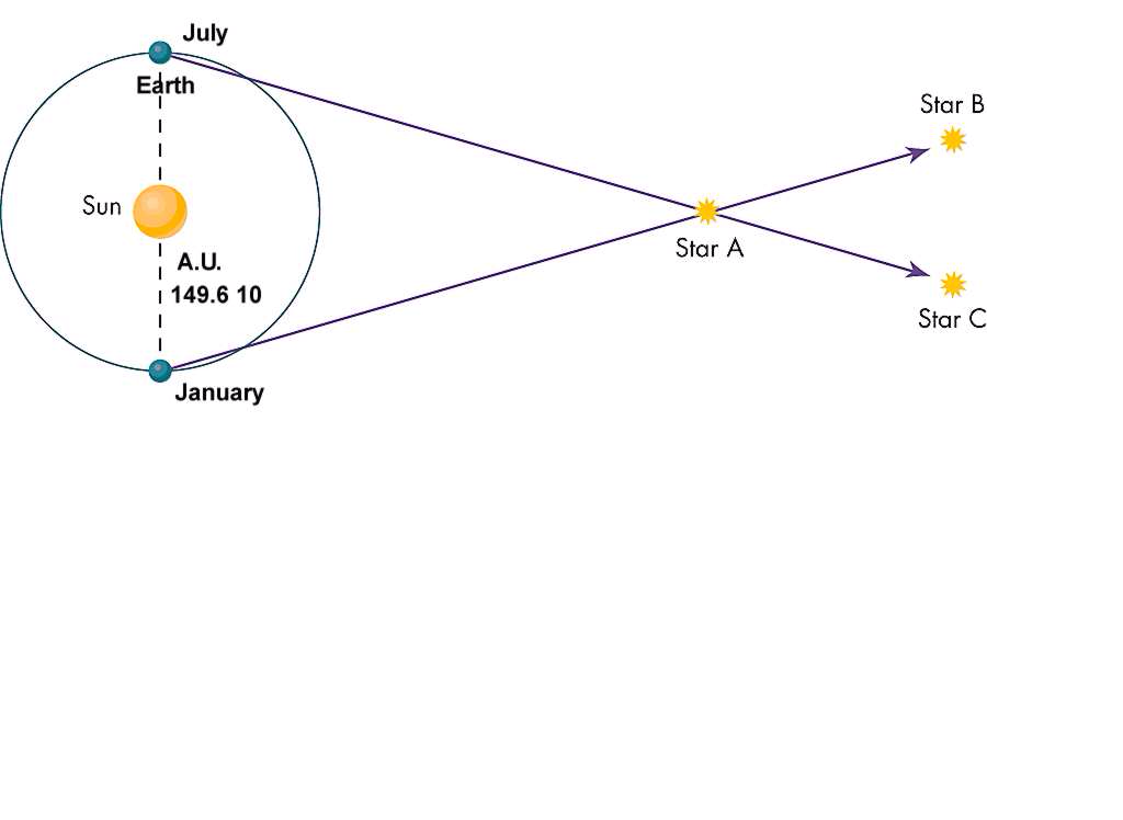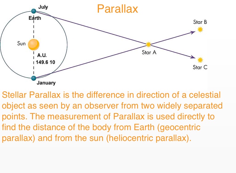 Stellar Parallax is the difference in direction of a celestial object as seen by an observer from two widely separated points. The measurement of Parallax is used directly to find the distance of the body from Earth (geocentric parallax) and from the sun (heliocentric parallax).