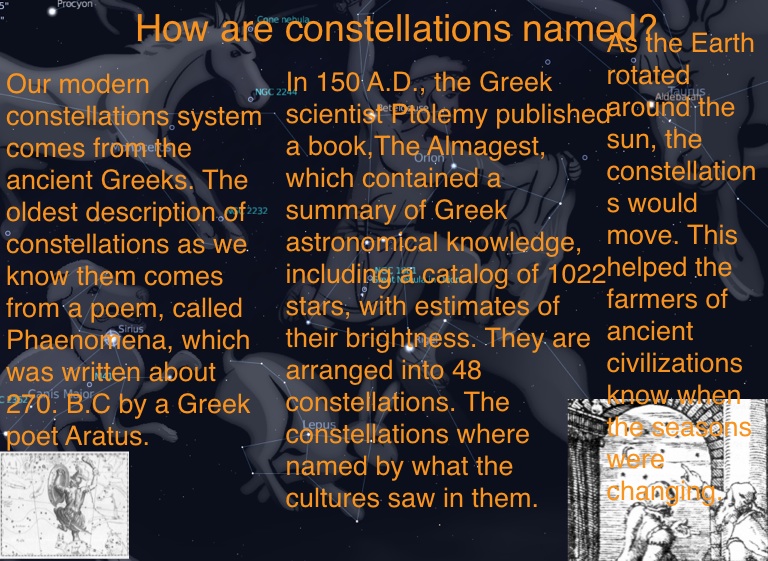 Our modern constellations system comes from the ancient Greeks. The oldest description of constellations as we know them comes from a poem, called Phaenomena, which was written about 270. B.C by a Greek poet Aratus.