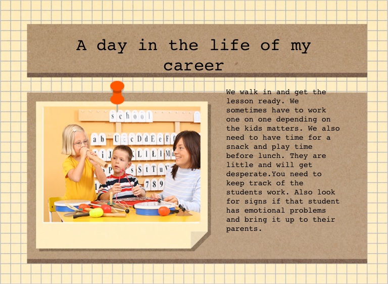 We walk in and get the lesson ready. We sometimes have to work one on one depending on the kids matters. We also need to have time for a snack and play time before lunch. They are little and will get desperate.You need to keep track of the students work. Also look for signs if that student has emotional problems and bring it up to their parents.