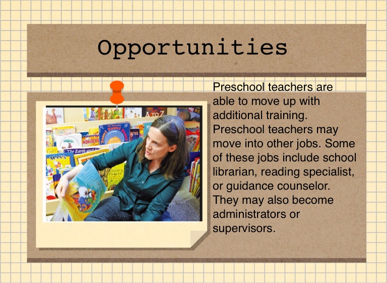 Preschool teachers are able to move up with additional training. Preschool teachers may move into other jobs. Some of these jobs include school librarian, reading specialist, or guidance counselor. They may also become administrators or supervisors.