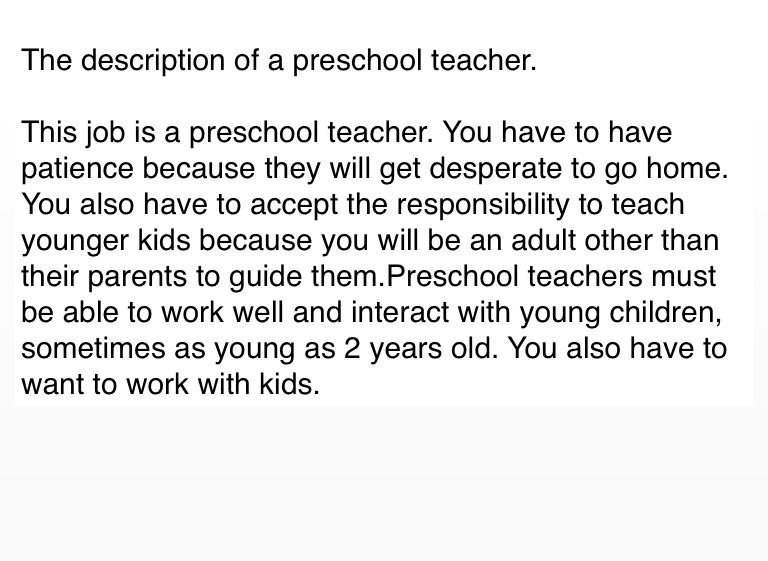 This job is a preschool teacher. You have to have patience because they will get desperate to go home. You also have to accept the responsibility to teach younger kids because you will be an adult other than their parents to guide them.Preschool teachers must be able to work well and interact with young children, sometimes as young as 2 years old. You also have to want to work with kids.