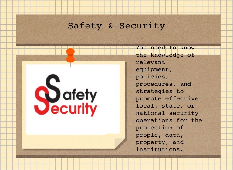 You need to know the knowledge of relevant equipment, policies, procedures, and strategies to promote effective local, state, or national security operations for the protection of people, data, property, and institutions.