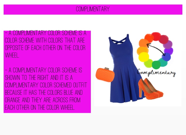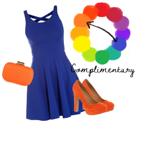 - a complimentary color scheme is shown to the right and it is a complimentary color schemed outfit because it has the colors blue and orange and they are across from each other on the color wheel.