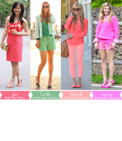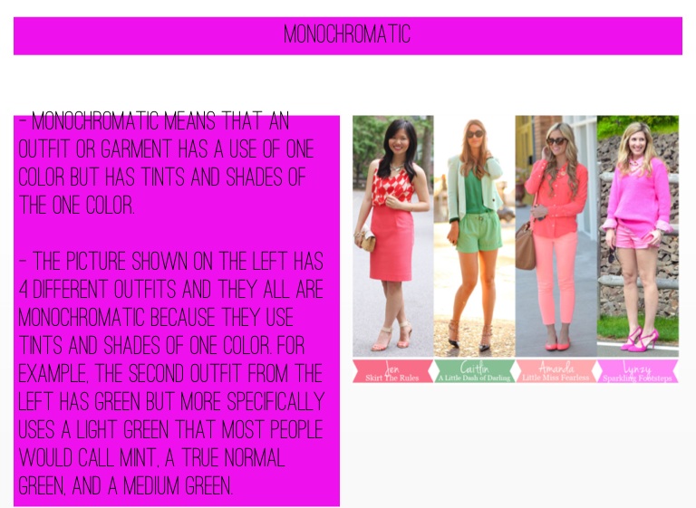 - the picture shown on the left has 4 different outfits and they all are monochromatic because they use tints and shades of one color. For example, the second outfit from the left has green but more specifically uses a light green that most people would call mint, a true normal green, and a medium green.