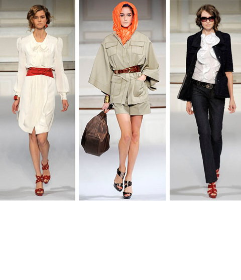-these outfits to the right have accented neutrals because the outfits are plain achromatic colors such as black, white, and beige but they are all also accented with colors. For examples the middle one has a beige outfit but has an added pop of color with the orange scarf.