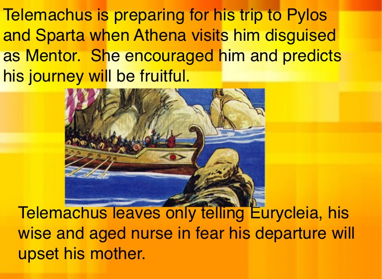 Telemachus is preparing for his trip to Pylos and Sparta when Athena visits him disguised as Mentor. She encouraged him and predicts his journey will be fruitful.