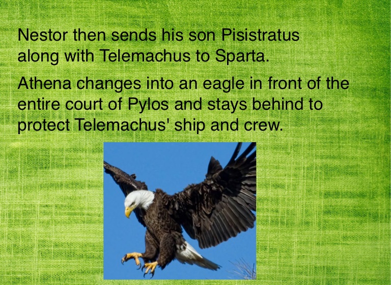 Athena changes into an eagle in front of the entire court of Pylos and stays behind to protect Telemachus' ship and crew.