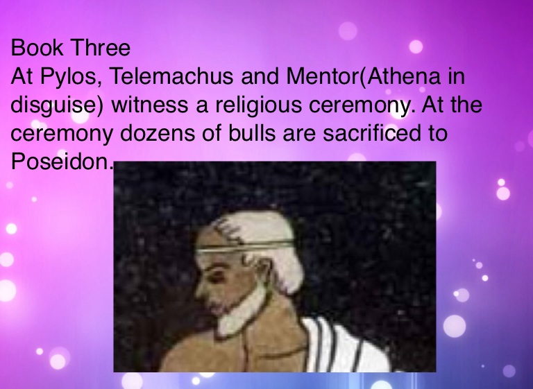 At Pylos, Telemachus and Mentor(Athena in disguise) witness a religious ceremony. At the ceremony dozens of bulls are sacrificed to Poseidon.