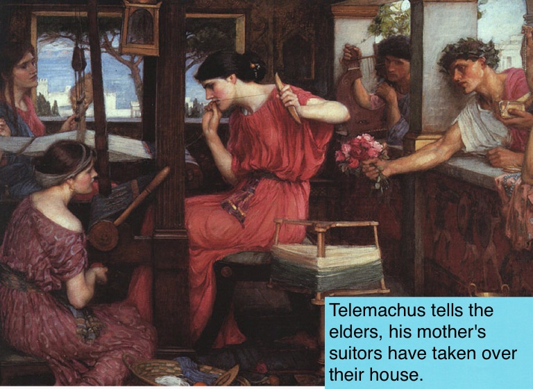 Telemachus tells the elders, his mother's suitors have taken over their house.