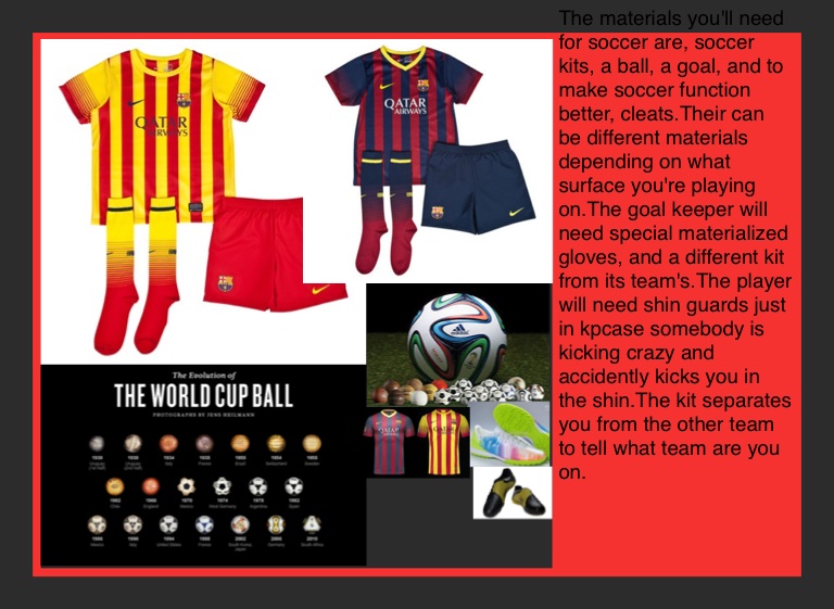 The materials you'll need for soccer are, soccer kits, a ball, a goal, and to make soccer function better, cleats.Their can be different materials depending on what surface you're playing on.The goal keeper will need special materialized gloves, and a different kit from its team's.The player will need shin guards just in kpcase somebody is kicking crazy and