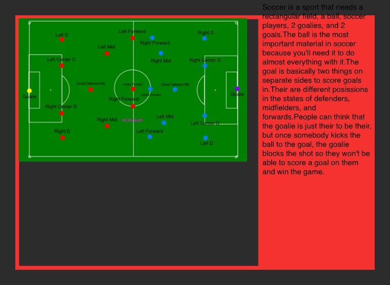 Soccer is a sport that needs a rectangular field, a ball, soccer players, 2 goalies, and 2 goals.The ball is the most important material in soccer because you'll need it to do almost everything with it.The goal is basically two things on separate sides to score goals in.Their are different posissions in the states of defenders, midfielders, and forwards.People can think that the goalie is just their to be their, but once somebody kicks the ball to the goal, the goalie blocks the shot so they won't be able to score a goal on them and win the game.