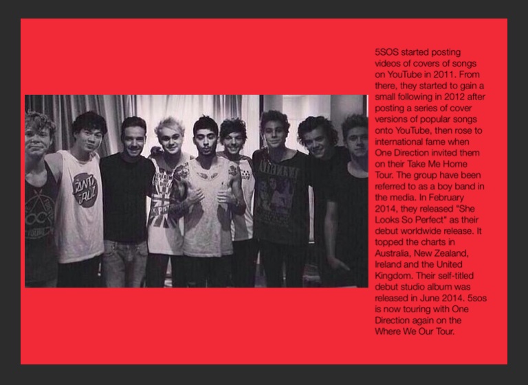 5SOS started posting videos of covers of songs on YouTube in 2011. From there, they started to gain a small following in 2012 after posting a series of cover versions of popular songs onto YouTube, then rose to international fame when One Direction invited them on their Take Me Home Tour. The group have been referred to as a boy band in the media. In February 2014, they released "She Looks So Perfect" as their debut worldwide release. It topped the charts in Australia, New Zealand, Ireland and the United Kingdom. Their self-titled debut studio album was released in June 2014. 5sos is now touring with One Direction again on the Where We Our Tour.