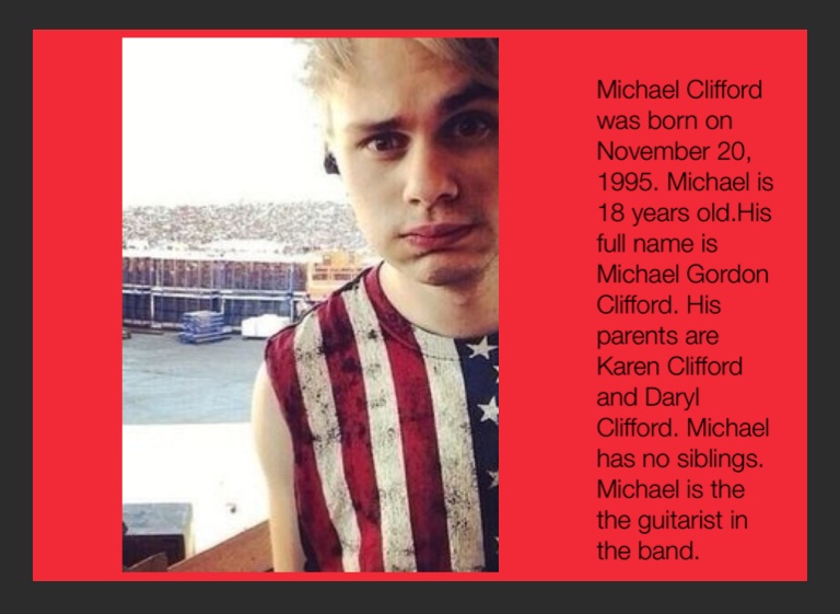 Michael Clifford was born on November 20, 1995. Michael is 18 years old.His full name is Michael Gordon Clifford. His parents are Karen Clifford and Daryl Clifford. Michael has no siblings. Michael is the the guitarist in the band.