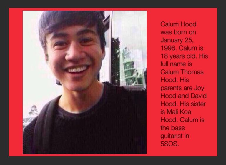 Calum Hood was born on January 25, 1996. Calum is 18 years old. His full name is Calum Thomas Hood. His parents are Joy Hood and David Hood. His sister is Mali Koa Hood. Calum is the bass guitarist in 5SOS.