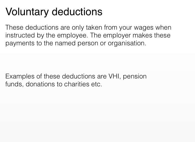 These deductions are only taken from your wages when instructed by the employee. The employer makes these payments to the named person or organisation.