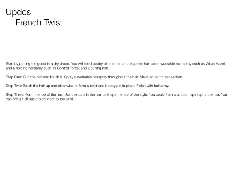 Start by putting the guest in a dry drape. You will need bobby pins to match the guests hair color, workable hair spray such as Witch Hazel, and a holding hairspray such as Control Force, and a curling iron.