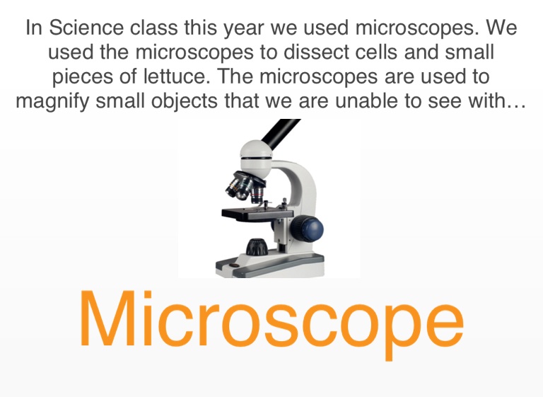 In Science class this year we used microscopes. We used the microscopes to dissect cells and small pieces of lettuce. The microscopes are used to magnify small objects that we are unable to see with the naked eye.