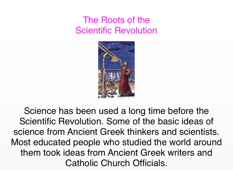 Science has been used a long time before the Scientific Revolution. Some of the basic ideas of science from Ancient Greek thinkers and scientists. Most educated people who studied the world around them took ideas from Ancient Greek writers and Catholic Church Officials.