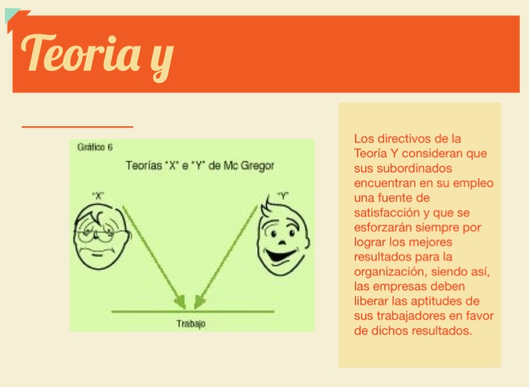 Los directivos de la Teoría Y consideran que sus subordinados encuentran en su empleo una fuente de satisfacción y que se esforzarán siempre por lograr los mejores resultados para la organización, siendo así, las empresas deben liberar las aptitudes de sus trabajadores en favor de dichos resultados.