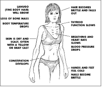 causes menses to stop, hair becomes brittle, and skin becomes yellow and unhealthy.