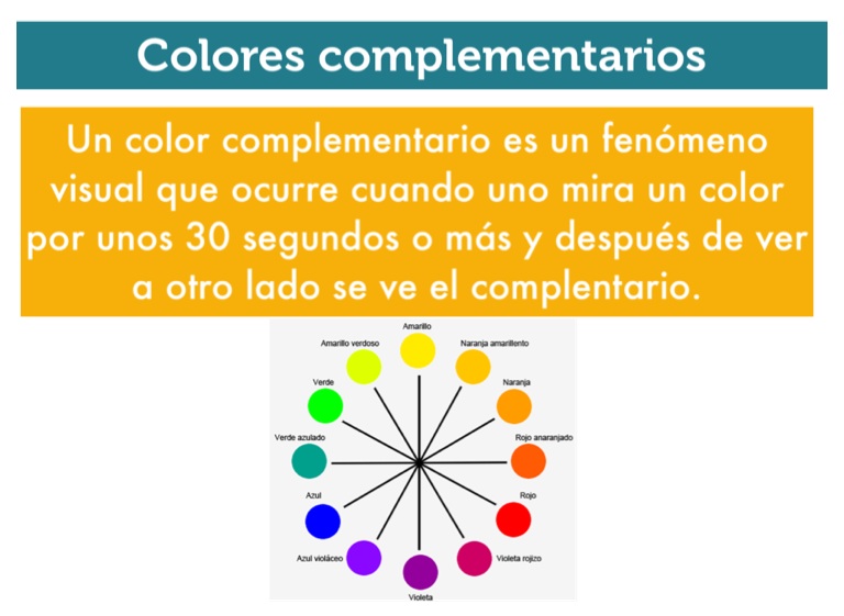 Un color complementario es un fenómeno visual que ocurre cuando uno mira un color por unos 30 segundos o más y después de ver a otro lado se ve el complentario.