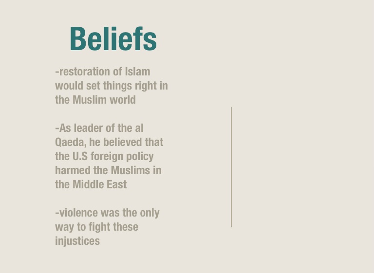 -As leader of the al Qaeda, he believed that the U.S foreign policy harmed the Muslims in the Middle East