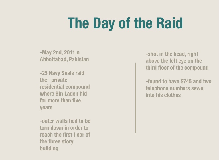 -25 Navy Seals raid the private residential compound where Bin Laden hid for more than five years