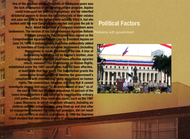 One of the greatest disappointments of the Aquino years was the lack of progress in the agrarian reform program. Aquino could have used her political honeymoon and her inherited dictatorial powers to divest the old aristocrats of their estates and pass out land to the farmers who actually tilled it, but she waited until the new Congress was elected and gave the job to them. About 90 percent of Congress members were landowners. The version of the Comprehensive Agrarian Reform Program passed by the Congress was signed as the Comprehensive Agrarian Reform Law by President Aquino on June 10, 1988. It included many loopholes deliberately added by members of Congress to enable landowners (including themselves) to evade the intent of the law. A bloc of landowning legislators led by Aquino's brother, Jose Cojuangco, resisted efforts to pass more effective agrarian reform measures.The Commission on Human Rights, established under the 1987 constitution, had not been effective, at least in its first four years. The Constitution grants the commission broad powers to monitor the government's compliance with international treaty obligations on human rights. The commission, however, claiming that it cannot investigate abuses that occur "in an environment of war," as of the end of 1989 had resolved only about 10 percent of the cases brought before it and reverted to investigating ordinary civil police matters. Even notorious cases, such as the 1987 Lupao Massacre, in which seventeen villagers, including six children and two octogenarians, were lined up and shot after an engagement between the army and guerrillas, did not result in any military or civilian convictions. In 1990 the Supreme Court decided that warrantless arrests of suspected subversives were constitutional.