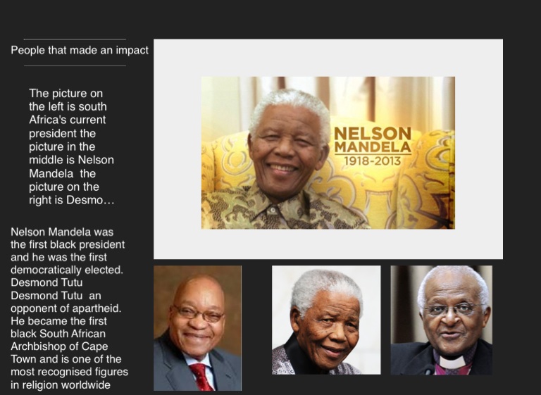 The picture on the left is south Africa's current president the picture in the middle is Nelson Mandela the picture on the right is Desmond Tutu